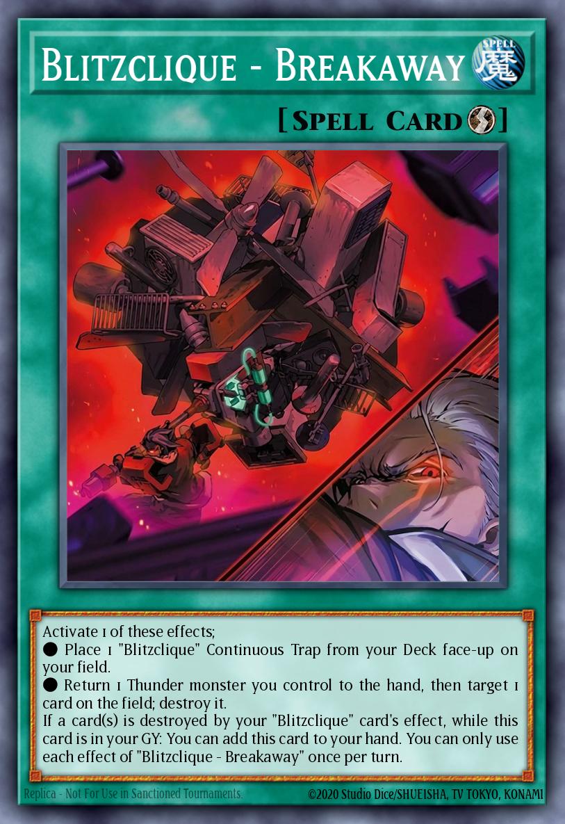 Activate 1 of these effects; ● Place 1 "Blitzclique" Continuous Trap from your Deck face-up on your field. ● Return 1 Thunder monster you control to the hand, then target 1 card on the field; destroy it. If a card(s) is destroyed by your "Blitzclique" card's effect, while this card is in your GY: You can add this card to your hand. You can only use each effect of "Blitzclique - Breakaway" once per turn.