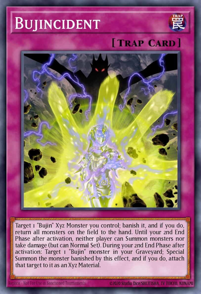 Target 1 "Bujin" Xyz Monster you control; banish it, and if you do, return all monsters on the field to the hand. Until your 2nd End Phase after activation, neither player can Summon monsters nor take damage (but can Normal Set). During your 2nd End Phase after activation: Target 1 "Bujin" monster in your Graveyard; Special Summon the monster banished by this effect, and if you do, attach that target to it as an Xyz Material.