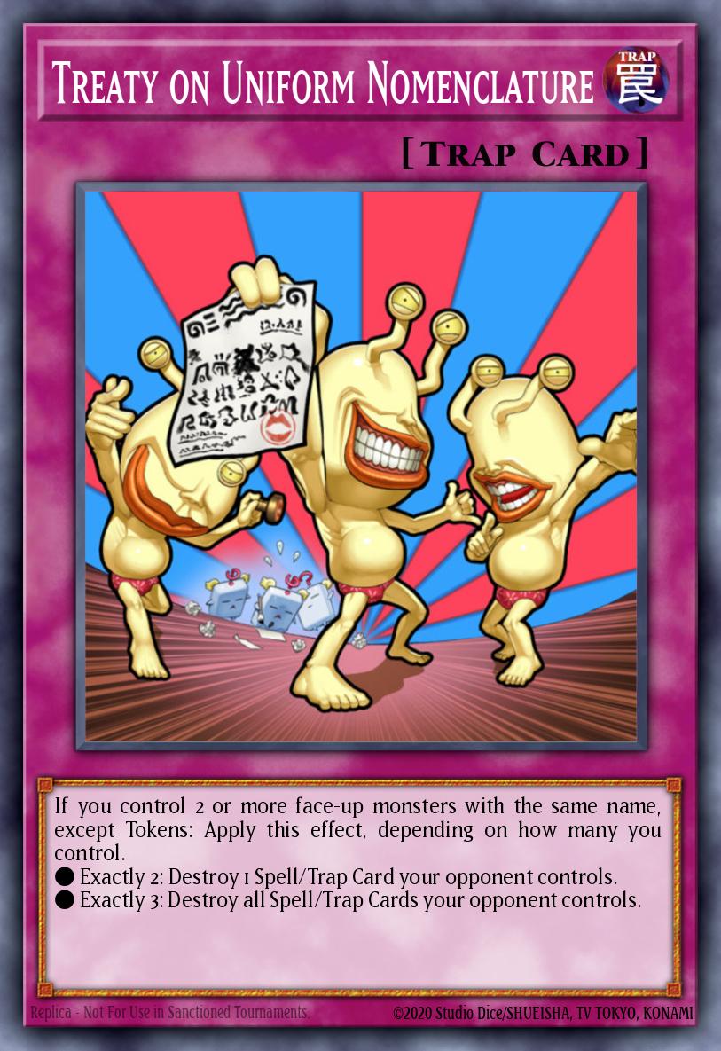 If you control 2 or more face-up monsters with the same name, except Tokens: Apply this effect, depending on how many you control. ● Exactly 2: Destroy 1 Spell/Trap Card your opponent controls. ● Exactly 3: Destroy all Spell/Trap Cards your opponent controls.