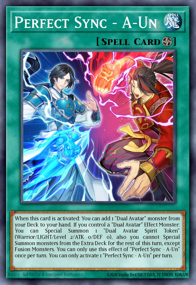 When this card is activated: You can add 1 "Dual Avatar" monster from your Deck to your hand. If you control a "Dual Avatar" Effect Monster: You can Special Summon 1 "Dual Avatar Spirit Token" (Warrior/LIGHT/Level 2/ATK 0/DEF 0), also you cannot Special Summon monsters from the Extra Deck for the rest of this turn, except Fusion Monsters. You can only use this effect of "Perfect Sync - A-Un" once per turn. You can only activate 1 "Perfect Sync - A-Un" per turn.