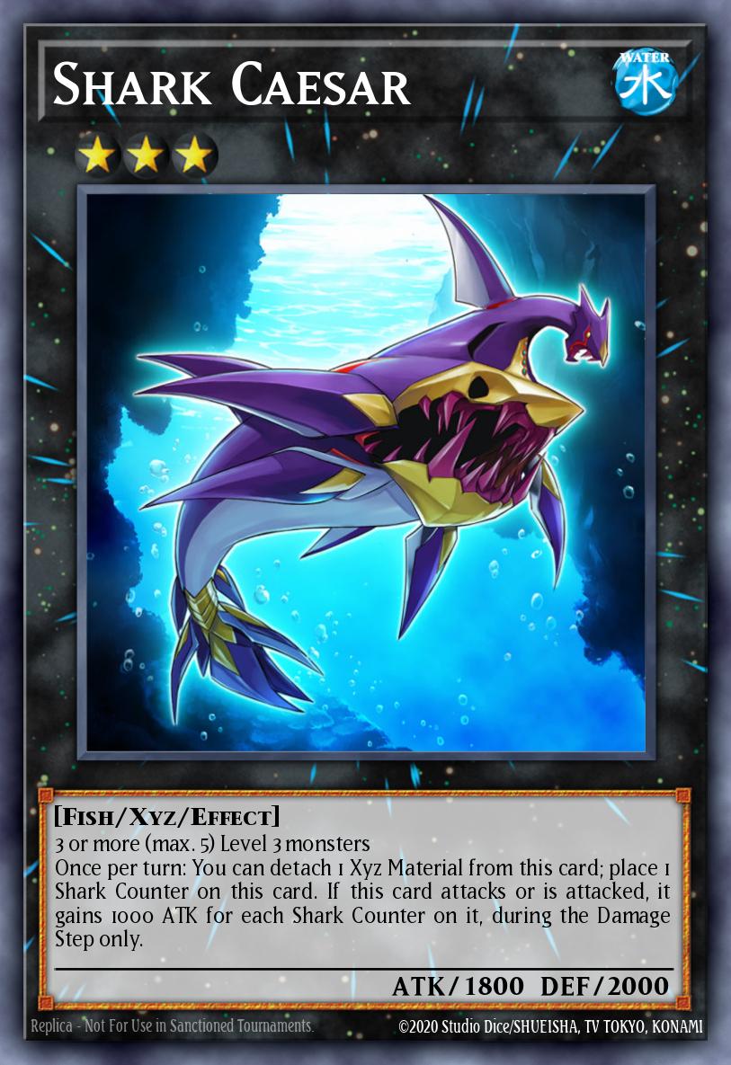 3 or more (max. 5) Level 3 monsters Once per turn: You can detach 1 Xyz Material from this card; place 1 Shark Counter on this card. If this card attacks or is attacked, it gains 1000 ATK for each Shark Counter on it, during the Damage Step only.