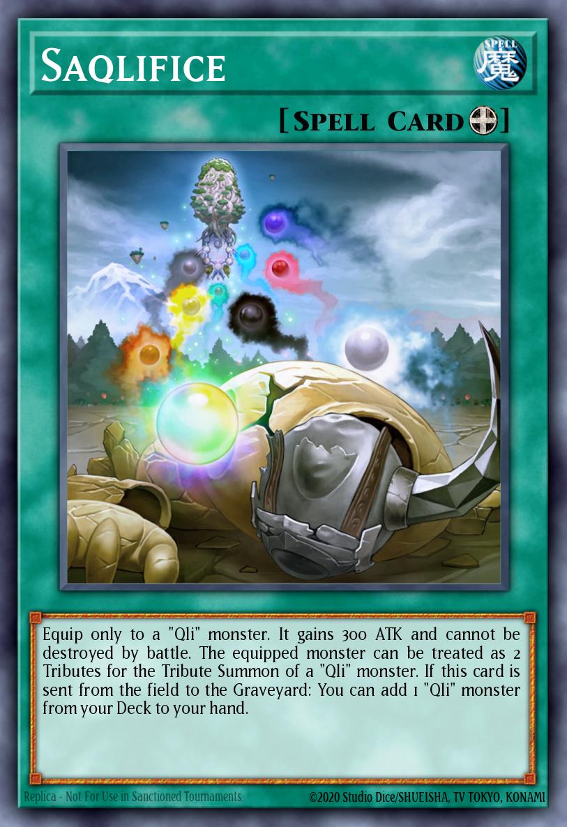 Equip only to a "Qli" monster. It gains 300 ATK and cannot be destroyed by battle. The equipped monster can be treated as 2 Tributes for the Tribute Summon of a "Qli" monster. If this card is sent from the field to the Graveyard: You can add 1 "Qli" monster from your Deck to your hand.