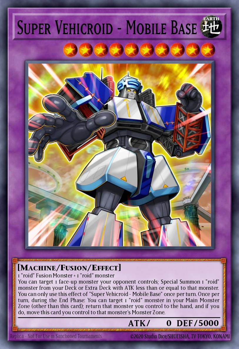 1 "roid" Fusion Monster + 1 "roid" monster You can target 1 face-up monster your opponent controls; Special Summon 1 "roid" monster from your Deck or Extra Deck with ATK less than or equal to that monster. You can only use this effect of "Super Vehicroid - Mobile Base" once per turn. Once per turn, during the End Phase: You can target 1 "roid" monster in your Main Monster Zone (other than this card); return that monster you control to the hand, and if you do, move this card you control to that monster's Monster Zone.