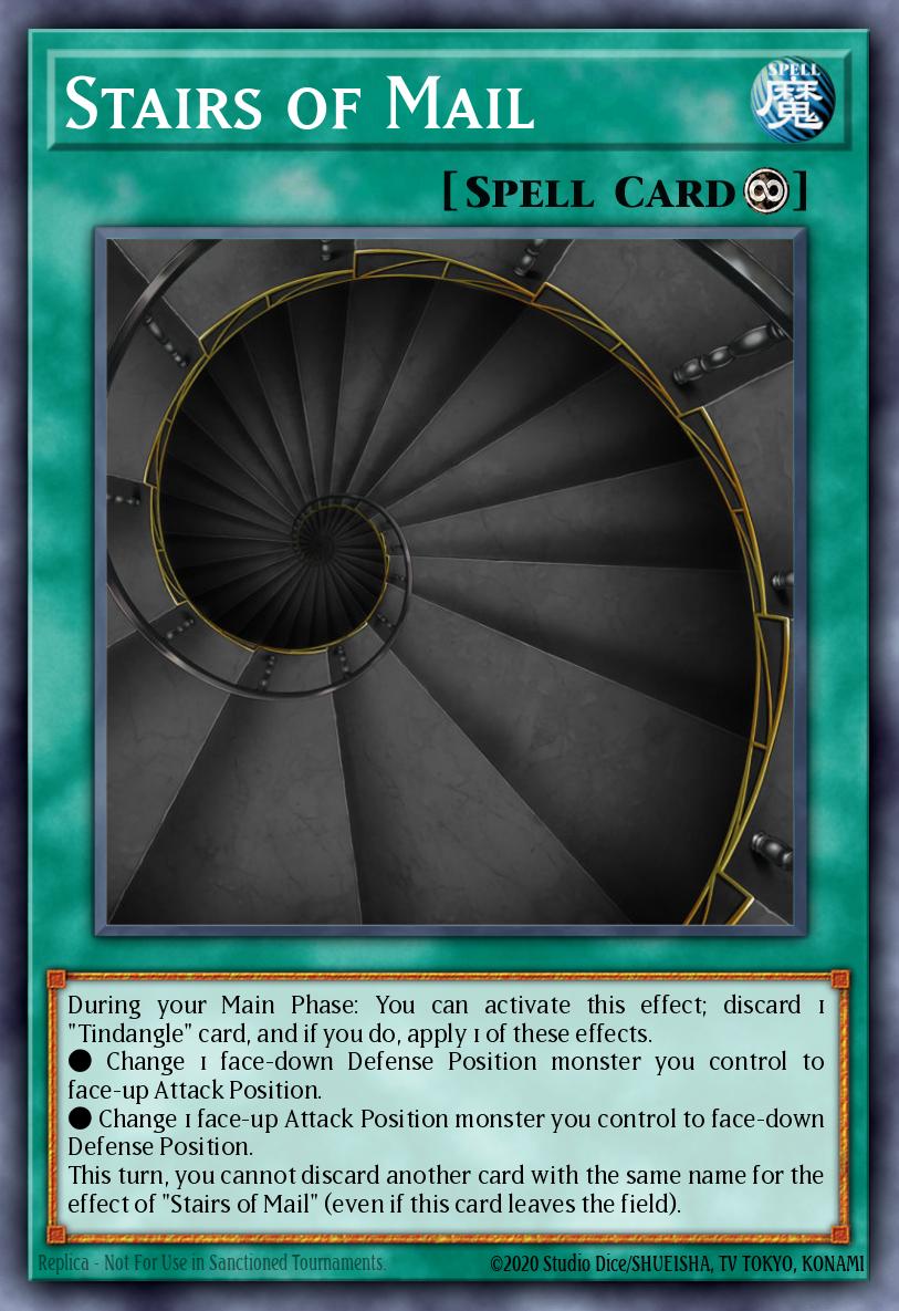 During your Main Phase: You can activate this effect; discard 1 "Tindangle" card, and if you do, apply 1 of these effects. ● Change 1 face-down Defense Position monster you control to face-up Attack Position. ● Change 1 face-up Attack Position monster you control to face-down Defense Position. This turn, you cannot discard another card with the same name for the effect of "Stairs of Mail" (even if this card leaves the field).