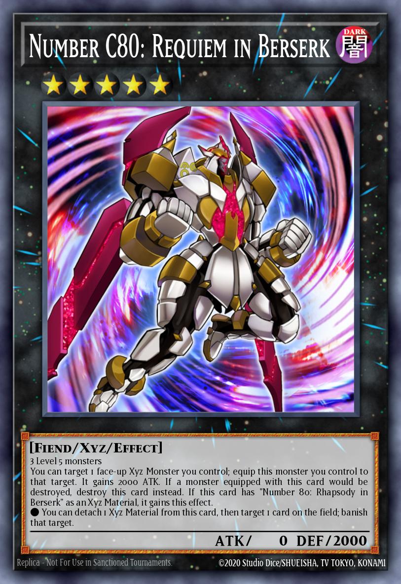 3 Level 5 monsters You can target 1 face-up Xyz Monster you control; equip this monster you control to that target. It gains 2000 ATK. If a monster equipped with this card would be destroyed, destroy this card instead. If this card has "Number 80: Rhapsody in Berserk" as an Xyz Material, it gains this effect. ● You can detach 1 Xyz Material from this card, then target 1 card on the field; banish that target.