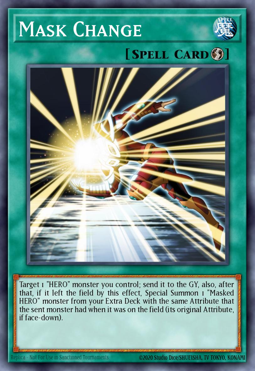 Target 1 "HERO" monster you control; send it to the GY, also, after that, if it left the field by this effect, Special Summon 1 "Masked HERO" monster from your Extra Deck with the same Attribute that the sent monster had when it was on the field (its original Attribute, if face-down).
