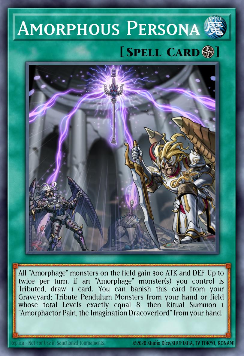 All "Amorphage" monsters on the field gain 300 ATK and DEF. Up to twice per turn, if an "Amorphage" monster(s) you control is Tributed, draw 1 card. You can banish this card from your Graveyard; Tribute Pendulum Monsters from your hand or field whose total Levels exactly equal 8, then Ritual Summon 1 "Amorphactor Pain, the Imagination Dracoverlord" from your hand.