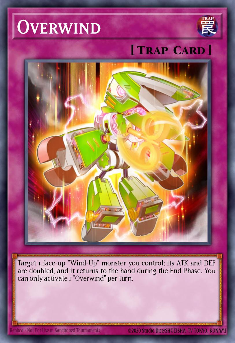 Target 1 face-up "Wind-Up" monster you control; its ATK and DEF are doubled, and it returns to the hand during the End Phase. You can only activate 1 "Overwind" per turn.