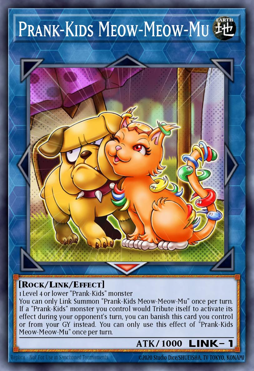 1 Level 4 or lower "Prank-Kids" monster You can only Link Summon "Prank-Kids Meow-Meow-Mu" once per turn. If a "Prank-Kids" monster you control would Tribute itself to activate its effect during your opponent's turn, you can banish this card you control or from your GY instead. You can only use this effect of "Prank-Kids Meow-Meow-Mu" once per turn.