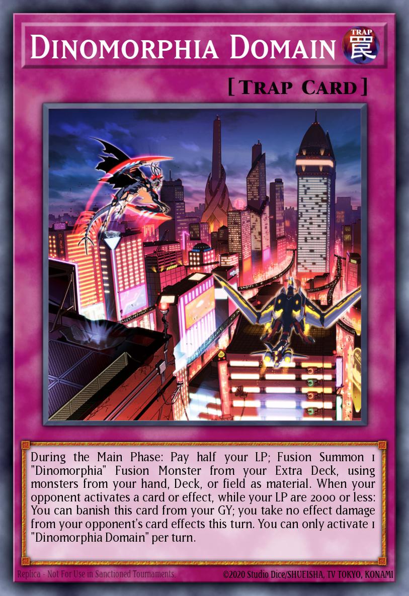 During the Main Phase: Pay half your LP; Fusion Summon 1 "Dinomorphia" Fusion Monster from your Extra Deck, using monsters from your hand, Deck, or field as material. When your opponent activates a card or effect, while your LP are 2000 or less: You can banish this card from your GY; you take no effect damage from your opponent's card effects this turn. You can only activate 1 "Dinomorphia Domain" per turn.