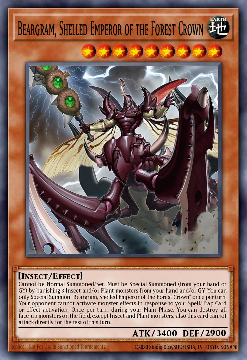 Cannot be Normal Summoned/Set. Must be Special Summoned (from your hand or GY) by banishing 3 Insect and/or Plant monsters from your hand and/or GY. You can only Special Summon "Beargram, Shelled Emperor of the Forest Crown" once per turn. Your opponent cannot activate monster effects in response to your Spell/Trap Card or effect activation. Once per turn, during your Main Phase: You can destroy all face-up monsters on the field, except Insect and Plant monsters, also this card cannot attack directly for the rest of this turn.