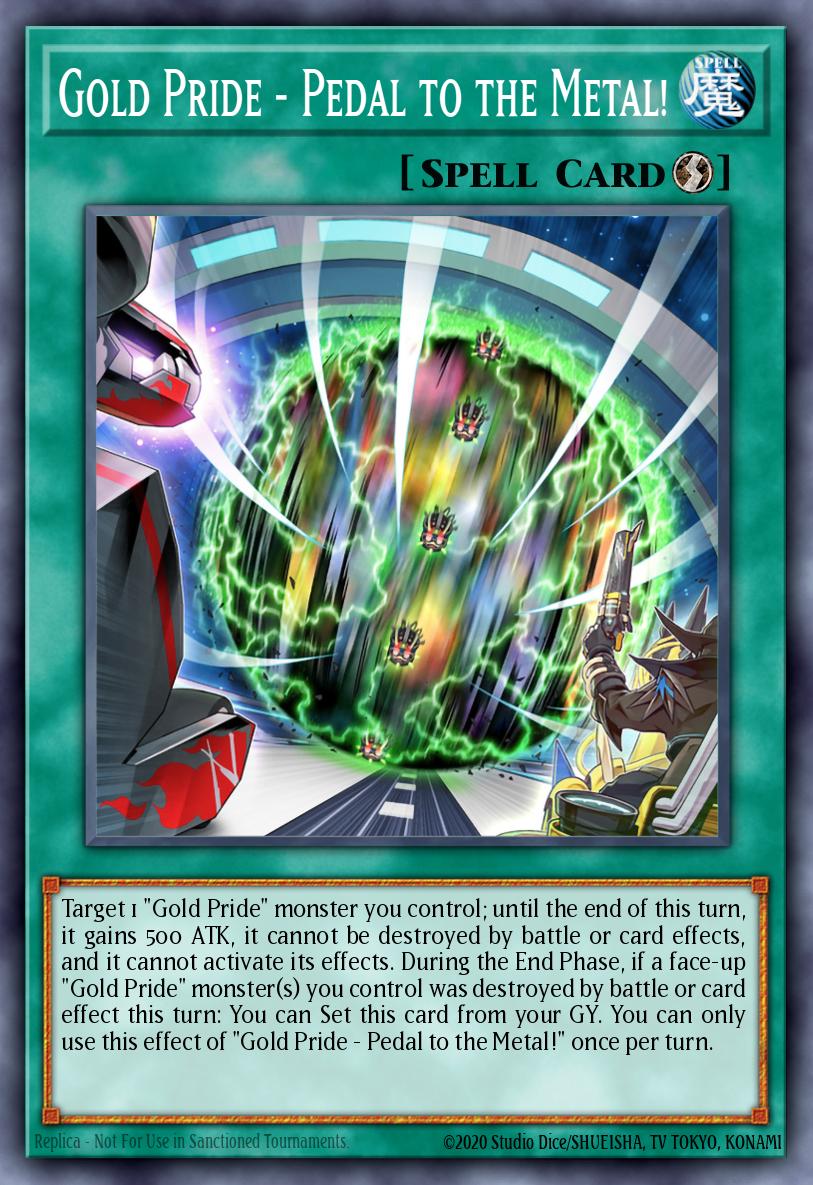 Target 1 "Gold Pride" monster you control; until the end of this turn, it gains 500 ATK, it cannot be destroyed by battle or card effects, and it cannot activate its effects. During the End Phase, if a face-up "Gold Pride" monster(s) you control was destroyed by battle or card effect this turn: You can Set this card from your GY. You can only use this effect of "Gold Pride - Pedal to the Metal!" once per turn.