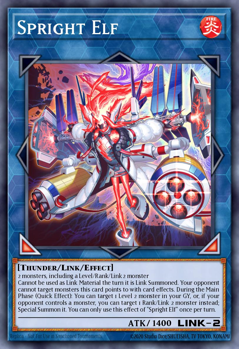 2 monsters, including a Level/Rank/Link 2 monster Cannot be used as Link Material the turn it is Link Summoned. Your opponent cannot target monsters this card points to with card effects. During the Main Phase (Quick Effect): You can target 1 Level 2 monster in your GY, or, if your opponent controls a monster, you can target 1 Rank/Link 2 monster instead; Special Summon it. You can only use this effect of "Spright Elf" once per turn.