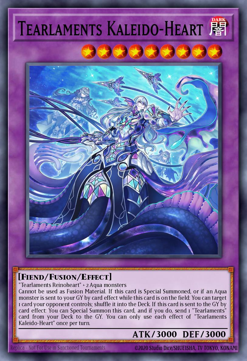 "Tearlaments Reinoheart" + 2 Aqua monsters Cannot be used as Fusion Material. If this card is Special Summoned, or if an Aqua monster is sent to your GY by card effect while this card is on the field: You can target 1 card your opponent controls; shuffle it into the Deck. If this card is sent to the GY by card effect: You can Special Summon this card, and if you do, send 1 "Tearlaments" card from your Deck to the GY. You can only use each effect of "Tearlaments Kaleido-Heart" once per turn.