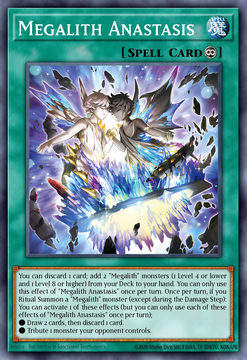 You can discard 1 card; add 2 "Megalith" monsters (1 Level 4 or lower and 1 Level 8 or higher) from your Deck to your hand. You can only use this effect of "Megalith Anastasis" once per turn. Once per turn, if you Ritual Summon a "Megalith" monster (except during the Damage Step): You can activate 1 of these effects (but you can only use each of these effects of "Megalith Anastasis" once per turn); ● Draw 2 cards, then discard 1 card. ● Tribute 1 monster your opponent controls.