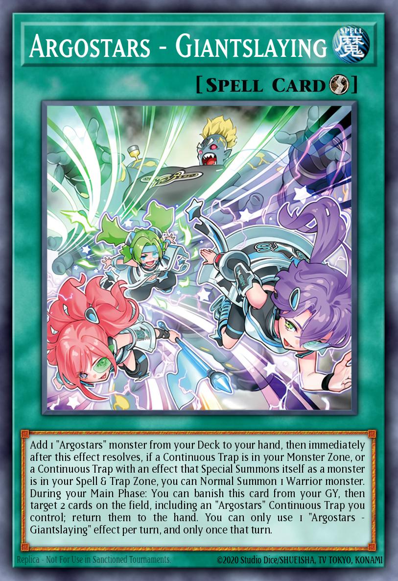 Add 1 "Argostars" monster from your Deck to your hand, then immediately after this effect resolves, if a Continuous Trap is in your Monster Zone, or a Continuous Trap with an effect that Special Summons itself as a monster is in your Spell & Trap Zone, you can Normal Summon 1 Warrior monster. During your Main Phase: You can banish this card from your GY, then target 2 cards on the field, including an "Argostars" Continuous Trap you control; return them to the hand. You can only use 1 "Argostars - Giantslaying" effect per turn, and only once that turn.