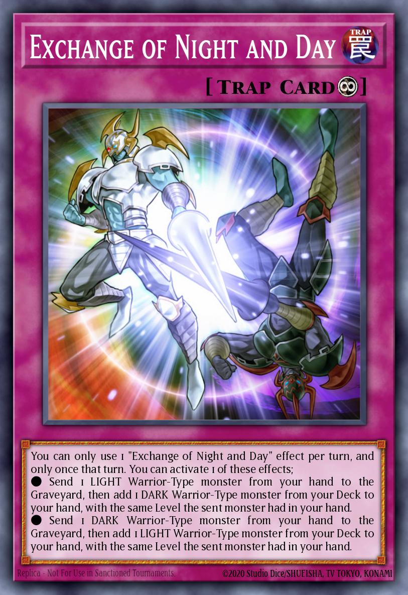 You can only use 1 "Exchange of Night and Day" effect per turn, and only once that turn. You can activate 1 of these effects; ● Send 1 LIGHT Warrior-Type monster from your hand to the Graveyard, then add 1 DARK Warrior-Type monster from your Deck to your hand, with the same Level the sent monster had in your hand. ● Send 1 DARK Warrior-Type monster from your hand to the Graveyard, then add 1 LIGHT Warrior-Type monster from your Deck to your hand, with the same Level the sent monster had in your hand.