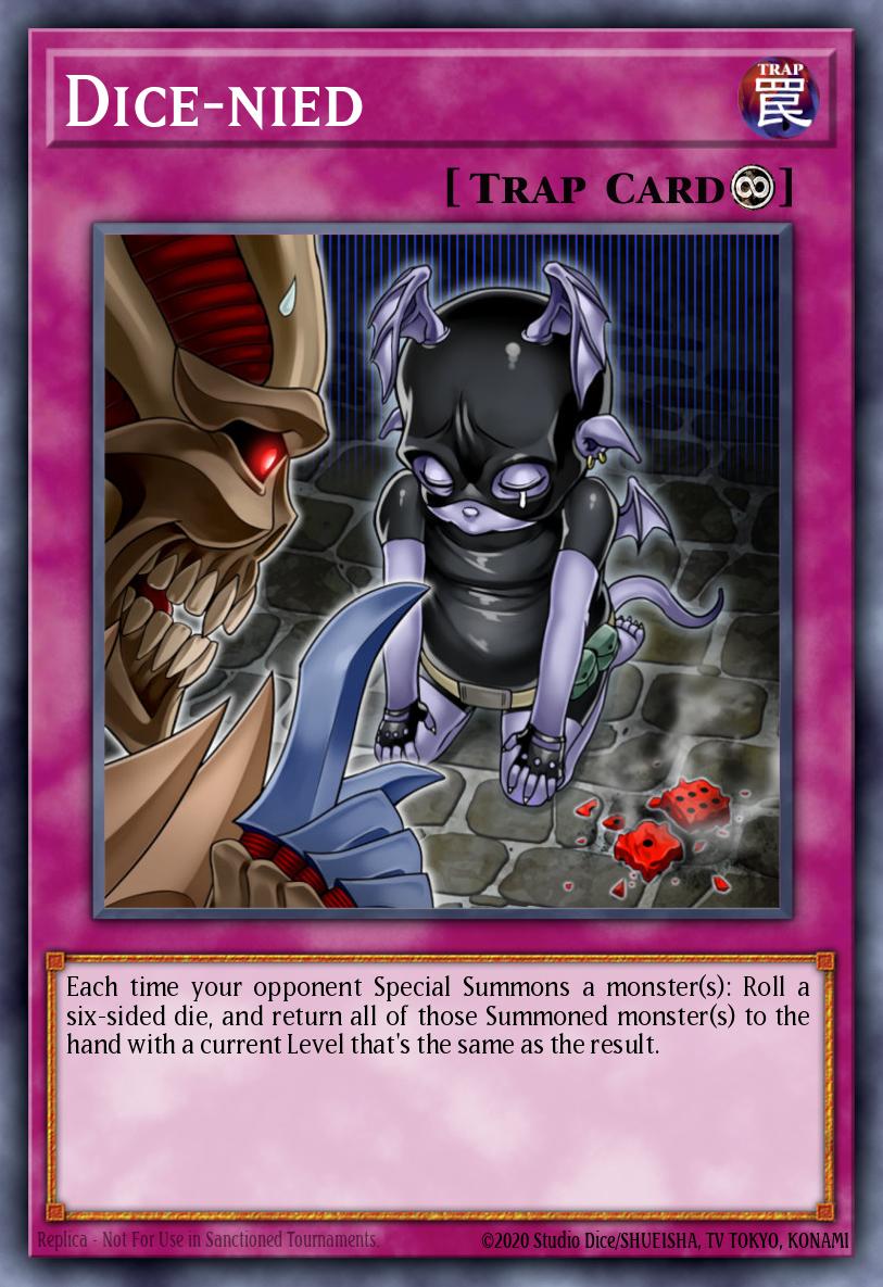 Each time your opponent Special Summons a monster(s): Roll a six-sided die, and return all of those Summoned monster(s) to the hand with a current Level that's the same as the result.
