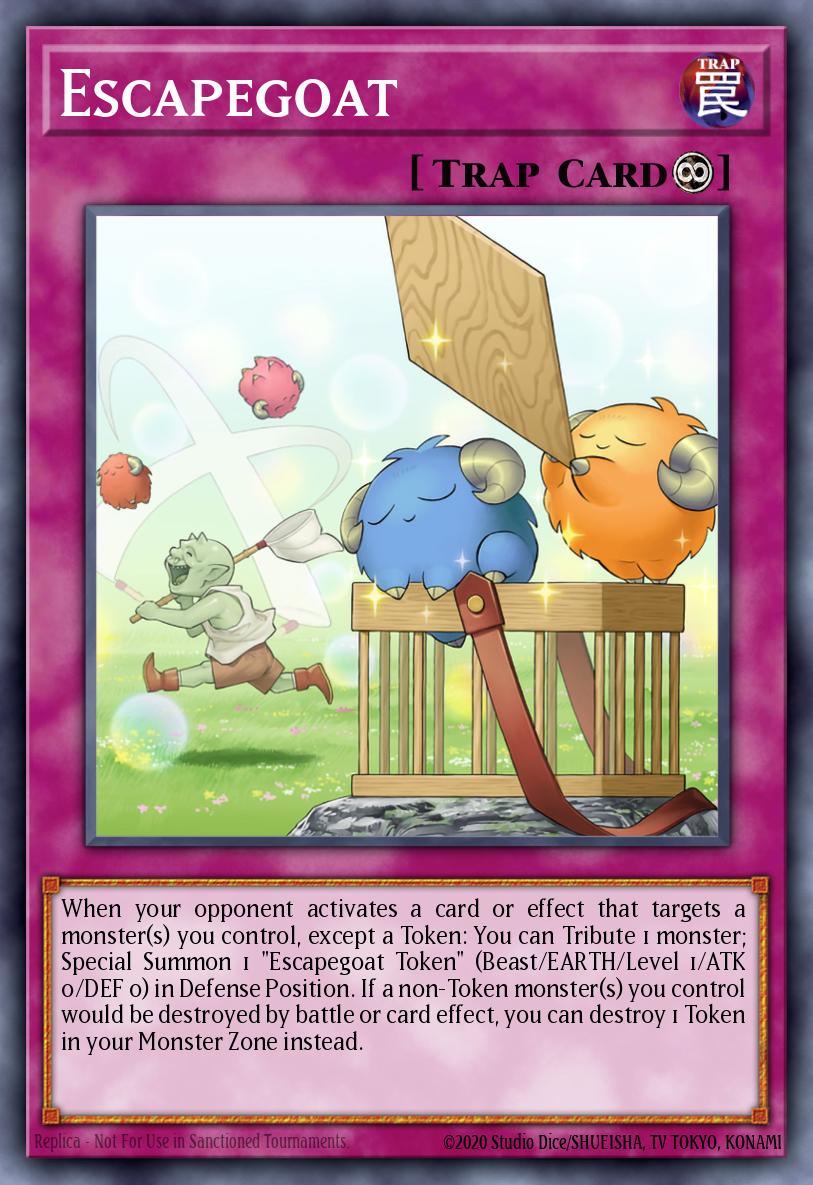 When your opponent activates a card or effect that targets a monster(s) you control, except a Token: You can Tribute 1 monster; Special Summon 1 "Escapegoat Token" (Beast/EARTH/Level 1/ATK 0/DEF 0) in Defense Position. If a non-Token monster(s) you control would be destroyed by battle or card effect, you can destroy 1 Token in your Monster Zone instead.