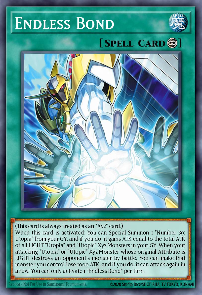 (This card is always treated as an "Xyz" card.) When this card is activated: You can Special Summon 1 "Number 39: Utopia" from your GY, and if you do, it gains ATK equal to the total ATK of all LIGHT "Utopia" and "Utopic" Xyz Monsters in your GY. When your attacking "Utopia" or "Utopic" Xyz Monster whose original Attribute is LIGHT destroys an opponent's monster by battle: You can make that monster you control lose 1000 ATK, and if you do, it can attack again in a row. You can only activate 1 "Endless Bond" per turn.