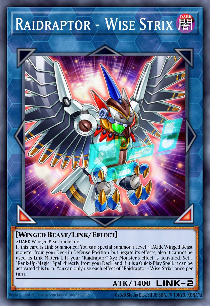 2 DARK Winged Beast monsters If this card is Link Summoned: You can Special Summon 1 Level 4 DARK Winged Beast monster from your Deck in Defense Position, but negate its effects, also it cannot be used as Link Material. If your "Raidraptor" Xyz Monster's effect is activated: Set 1 "Rank-Up-Magic" Spell directly from your Deck, and if it is a Quick-Play Spell, it can be activated this turn. You can only use each effect of "Raidraptor - Wise Strix" once per turn.