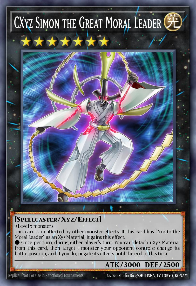 3 Level 7 monsters This card is unaffected by other monster effects. If this card has "Norito the Moral Leader" as an Xyz Material, it gains this effect. ● Once per turn, during either player's turn: You can detach 1 Xyz Material from this card, then target 1 monster your opponent controls; change its battle position, and if you do, negate its effects until the end of this turn.