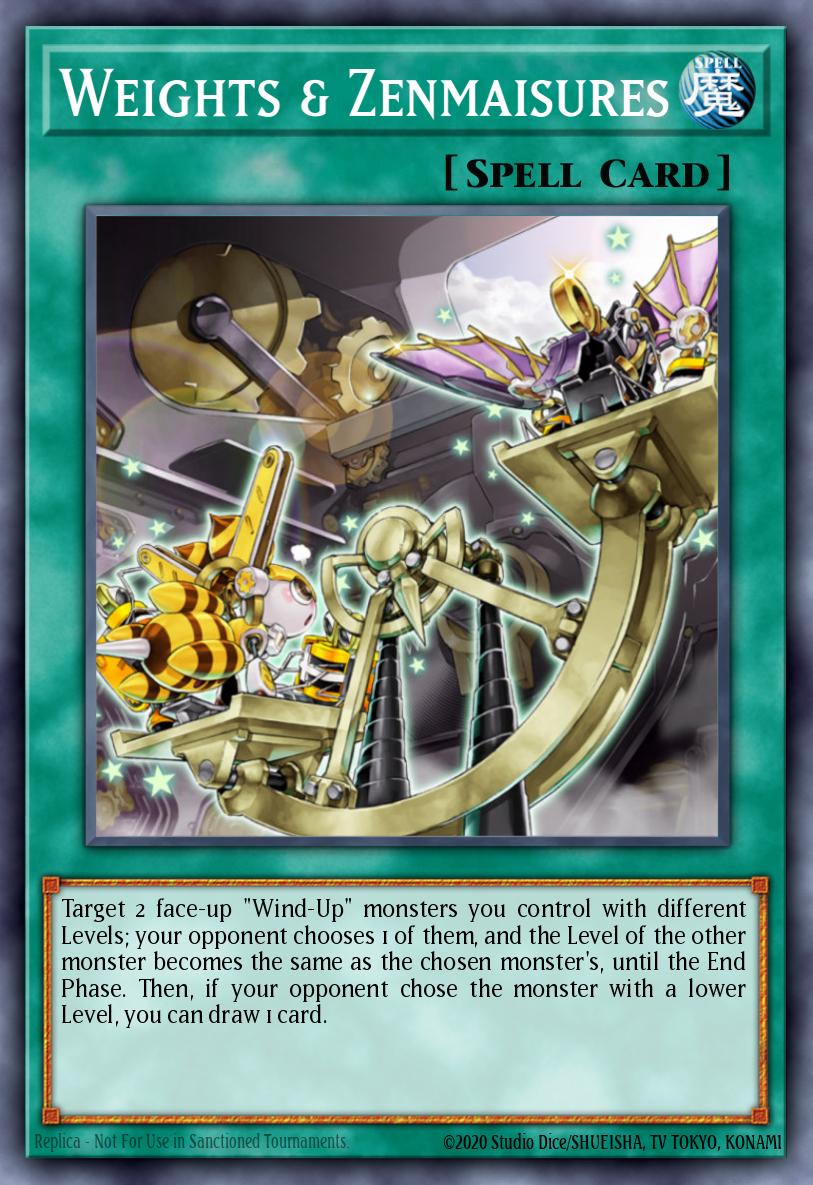 Target 2 face-up "Wind-Up" monsters you control with different Levels; your opponent chooses 1 of them, and the Level of the other monster becomes the same as the chosen monster's, until the End Phase. Then, if your opponent chose the monster with a lower Level, you can draw 1 card.