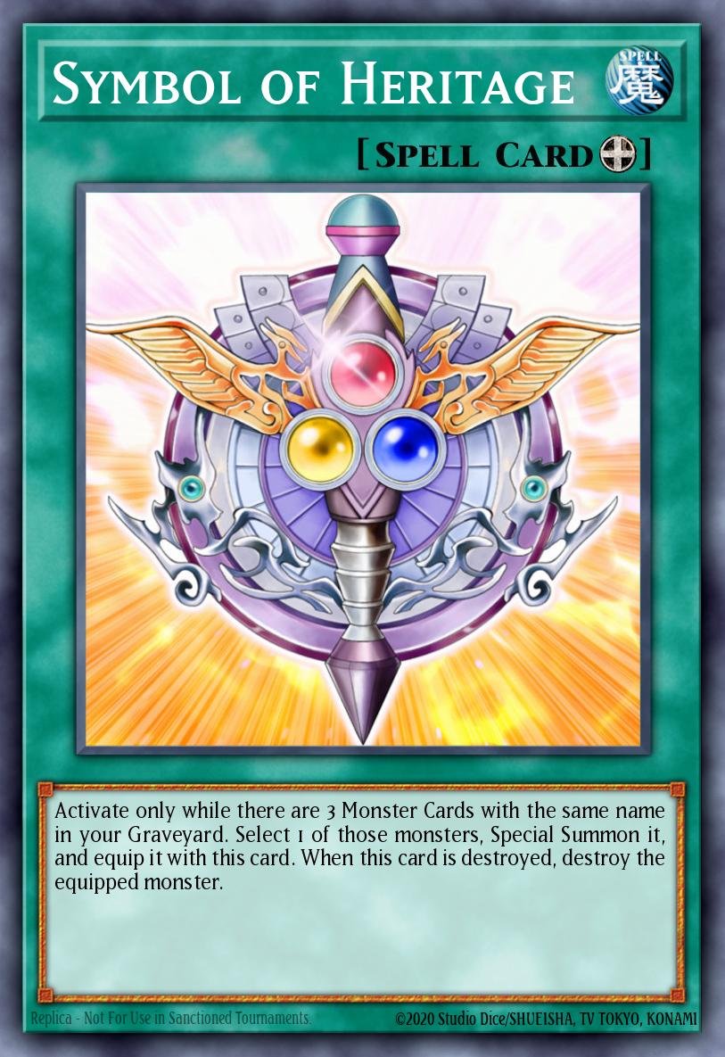 Activate only while there are 3 Monster Cards with the same name in your Graveyard. Select 1 of those monsters, Special Summon it, and equip it with this card. When this card is destroyed, destroy the equipped monster.