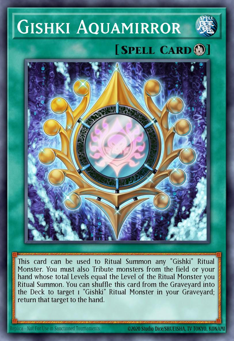 This card can be used to Ritual Summon any "Gishki" Ritual Monster. You must also Tribute monsters from the field or your hand whose total Levels equal the Level of the Ritual Monster you Ritual Summon. You can shuffle this card from the Graveyard into the Deck to target 1 "Gishki" Ritual Monster in your Graveyard; return that target to the hand.