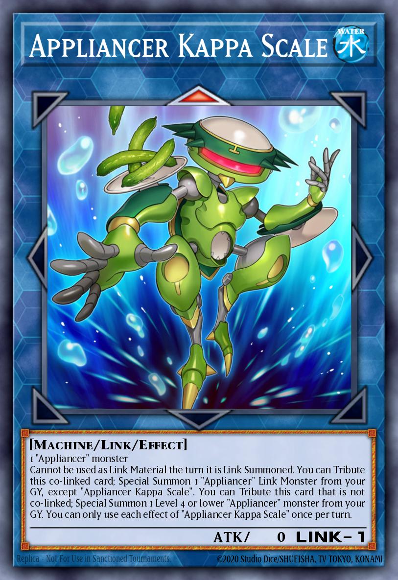 1 "Appliancer" monster Cannot be used as Link Material the turn it is Link Summoned. You can Tribute this co-linked card; Special Summon 1 "Appliancer" Link Monster from your GY, except "Appliancer Kappa Scale". You can Tribute this card that is not co-linked; Special Summon 1 Level 4 or lower "Appliancer" monster from your GY. You can only use each effect of "Appliancer Kappa Scale" once per turn.