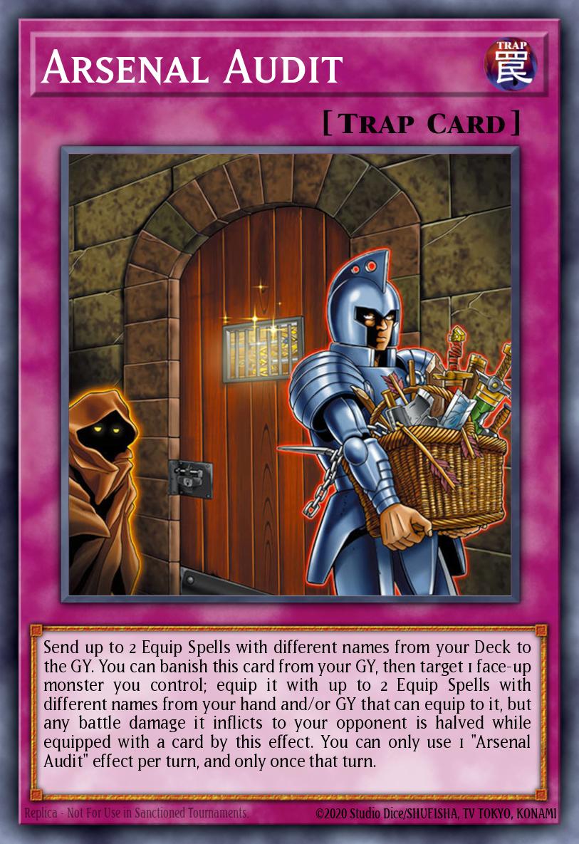 Send up to 2 Equip Spells with different names from your Deck to the GY. You can banish this card from your GY, then target 1 face-up monster you control; equip it with up to 2 Equip Spells with different names from your hand and/or GY that can equip to it, but any battle damage it inflicts to your opponent is halved while equipped with a card by this effect. You can only use 1 "Arsenal Audit" effect per turn, and only once that turn.