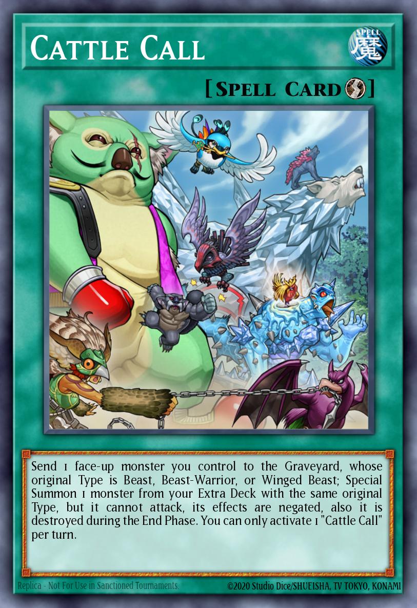Send 1 face-up monster you control to the Graveyard, whose original Type is Beast, Beast-Warrior, or Winged Beast; Special Summon 1 monster from your Extra Deck with the same original Type, but it cannot attack, its effects are negated, also it is destroyed during the End Phase. You can only activate 1 "Cattle Call" per turn.