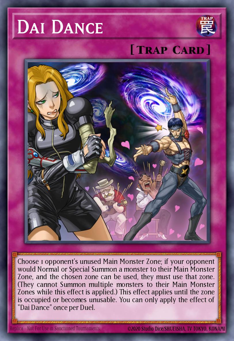 Choose 1 opponent's unused Main Monster Zone; if your opponent would Normal or Special Summon a monster to their Main Monster Zone, and the chosen zone can be used, they must use that zone. (They cannot Summon multiple monsters to their Main Monster Zones while this effect is applied.) This effect applies until the zone is occupied or becomes unusable. You can only apply the effect of "Dai Dance" once per Duel.