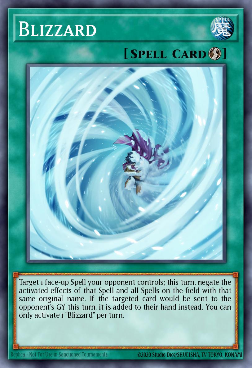 Target 1 face-up Spell your opponent controls; this turn, negate the activated effects of that Spell and all Spells on the field with that same original name. If the targeted card would be sent to the opponent's GY this turn, it is added to their hand instead. You can only activate 1 "Blizzard" per turn.