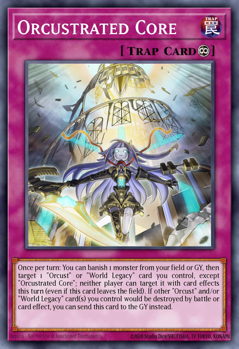 Once per turn: You can banish 1 monster from your field or GY, then target 1 "Orcust" or "World Legacy" card you control, except "Orcustrated Core"; neither player can target it with card effects this turn (even if this card leaves the field). If other "Orcust" and/or "World Legacy" card(s) you control would be destroyed by battle or card effect, you can send this card to the GY instead.