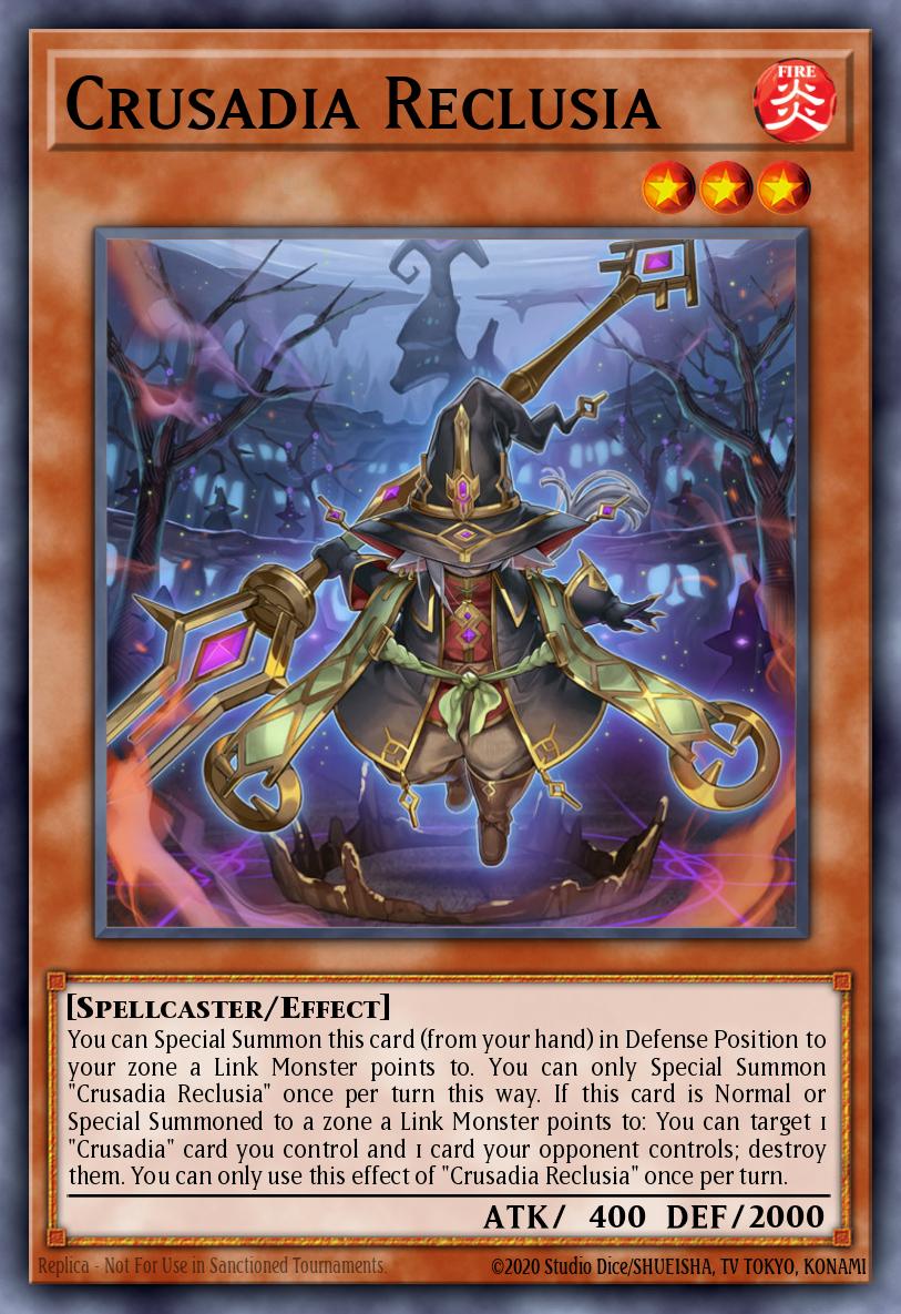You can Special Summon this card (from your hand) in Defense Position to your zone a Link Monster points to. You can only Special Summon "Crusadia Reclusia" once per turn this way. If this card is Normal or Special Summoned to a zone a Link Monster points to: You can target 1 "Crusadia" card you control and 1 card your opponent controls; destroy them. You can only use this effect of "Crusadia Reclusia" once per turn.