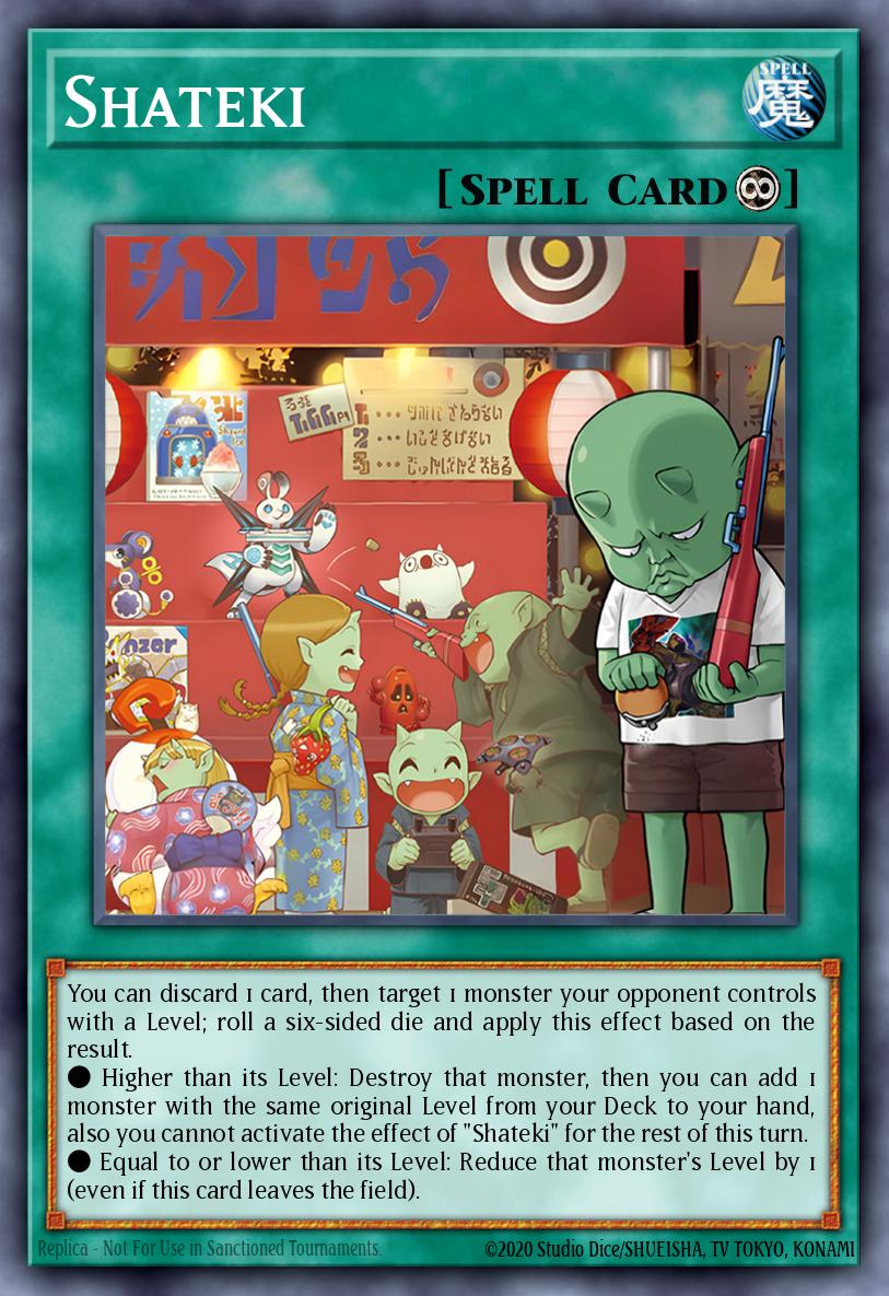 You can discard 1 card, then target 1 monster your opponent controls with a Level; roll a six-sided die and apply this effect based on the result. ● Higher than its Level: Destroy that monster, then you can add 1 monster with the same original Level from your Deck to your hand, also you cannot activate the effect of "Shateki" for the rest of this turn. ● Equal to or lower than its Level: Reduce that monster's Level by 1 (even if this card leaves the field).