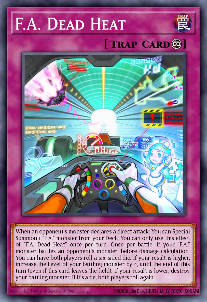 When an opponent's monster declares a direct attack: You can Special Summon 1 "F.A." monster from your Deck. You can only use this effect of "F.A. Dead Heat" once per turn. Once per battle, if your "F.A." monster battles an opponent's monster, before damage calculation: You can have both players roll a six-sided die. If your result is higher, increase the Level of your battling monster by 4, until the end of this turn (even if this card leaves the field). If your result is lower, destroy your battling monster. If it's a tie, both players roll again.