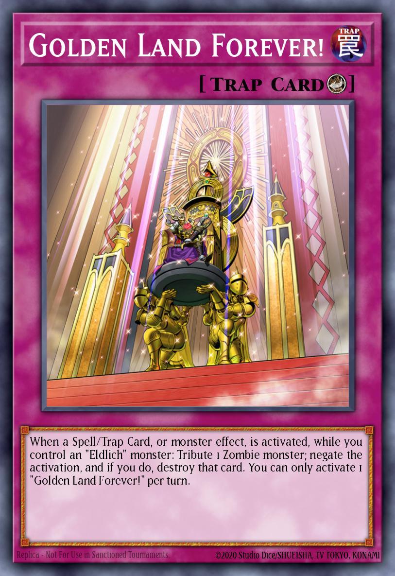 When a Spell/Trap Card, or monster effect, is activated, while you control an "Eldlich" monster: Tribute 1 Zombie monster; negate the activation, and if you do, destroy that card. You can only activate 1 "Golden Land Forever!" per turn.