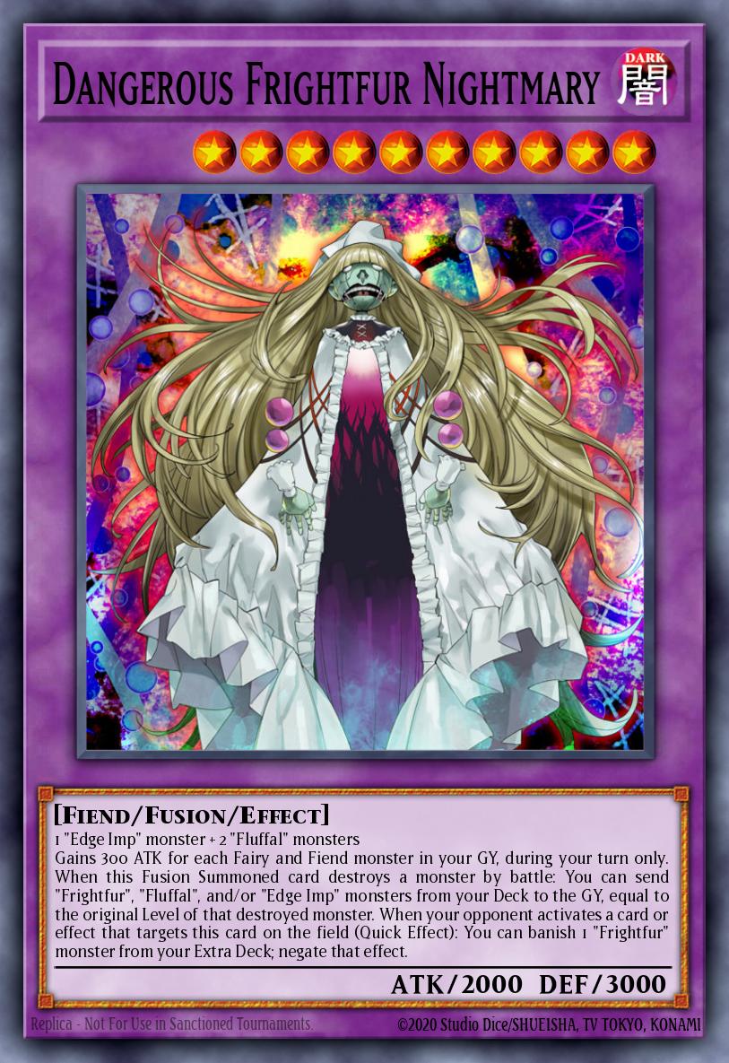 1 "Edge Imp" monster + 2 "Fluffal" monsters Gains 300 ATK for each Fairy and Fiend monster in your GY, during your turn only. When this Fusion Summoned card destroys a monster by battle: You can send "Frightfur", "Fluffal", and/or "Edge Imp" monsters from your Deck to the GY, equal to the original Level of that destroyed monster. When your opponent activates a card or effect that targets this card on the field (Quick Effect): You can banish 1 "Frightfur" monster from your Extra Deck; negate that effect.