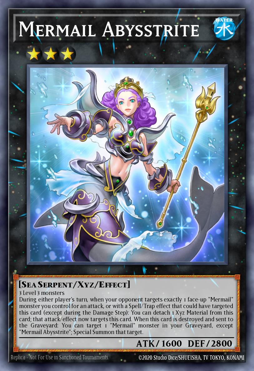 3 Level 3 monsters During either player's turn, when your opponent targets exactly 1 face-up "Mermail" monster you control for an attack, or with a Spell/Trap effect that could have targeted this card (except during the Damage Step): You can detach 1 Xyz Material from this card; that attack/effect now targets this card. When this card is destroyed and sent to the Graveyard: You can target 1 "Mermail" monster in your Graveyard, except "Mermail Abysstrite"; Special Summon that target.