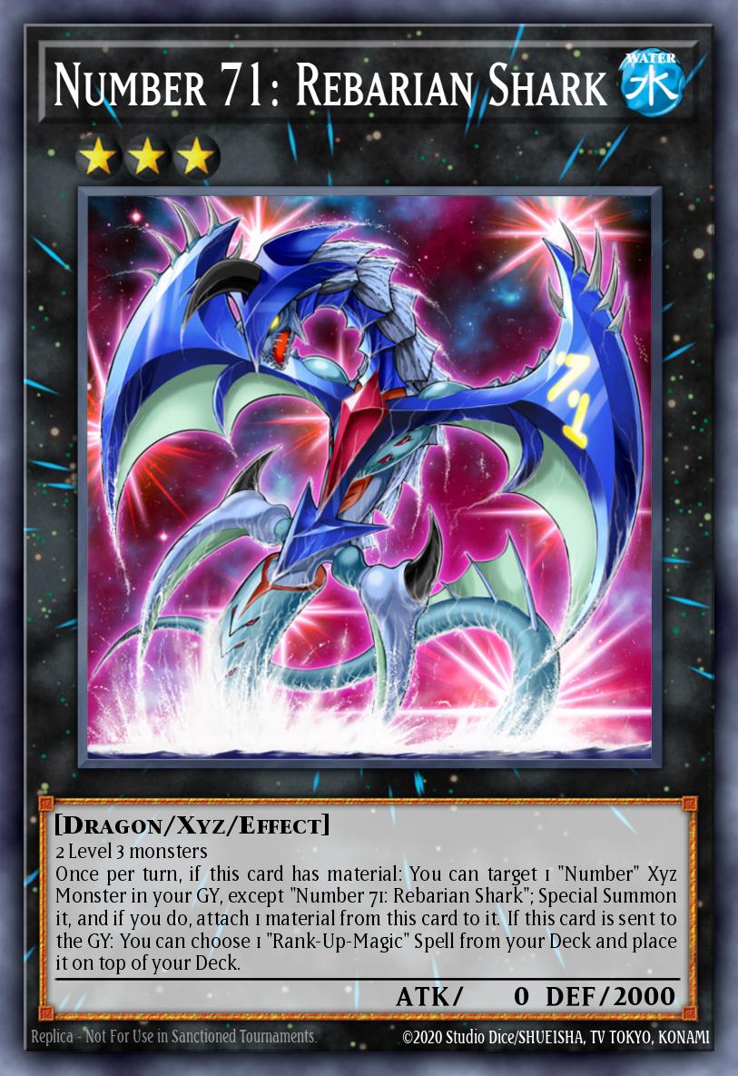 2 Level 3 monsters Once per turn, if this card has material: You can target 1 "Number" Xyz Monster in your GY, except "Number 71: Rebarian Shark"; Special Summon it, and if you do, attach 1 material from this card to it. If this card is sent to the GY: You can choose 1 "Rank-Up-Magic" Spell from your Deck and place it on top of your Deck.