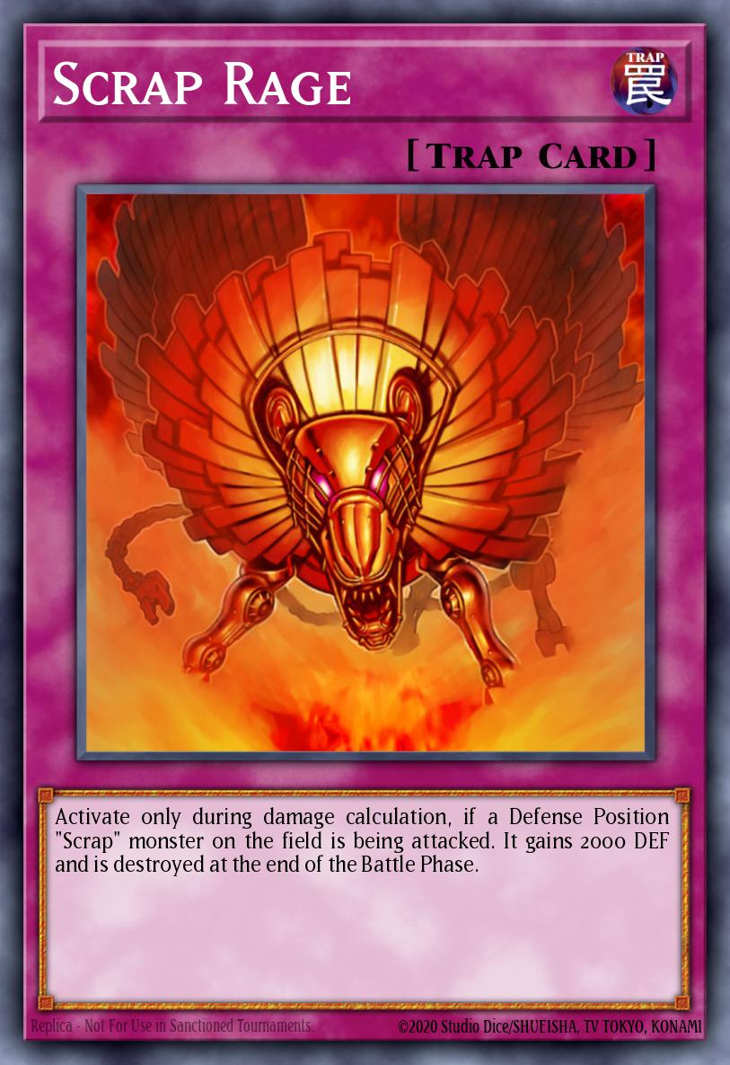 Activate only during damage calculation, if a Defense Position "Scrap" monster on the field is being attacked. It gains 2000 DEF and is destroyed at the end of the Battle Phase.