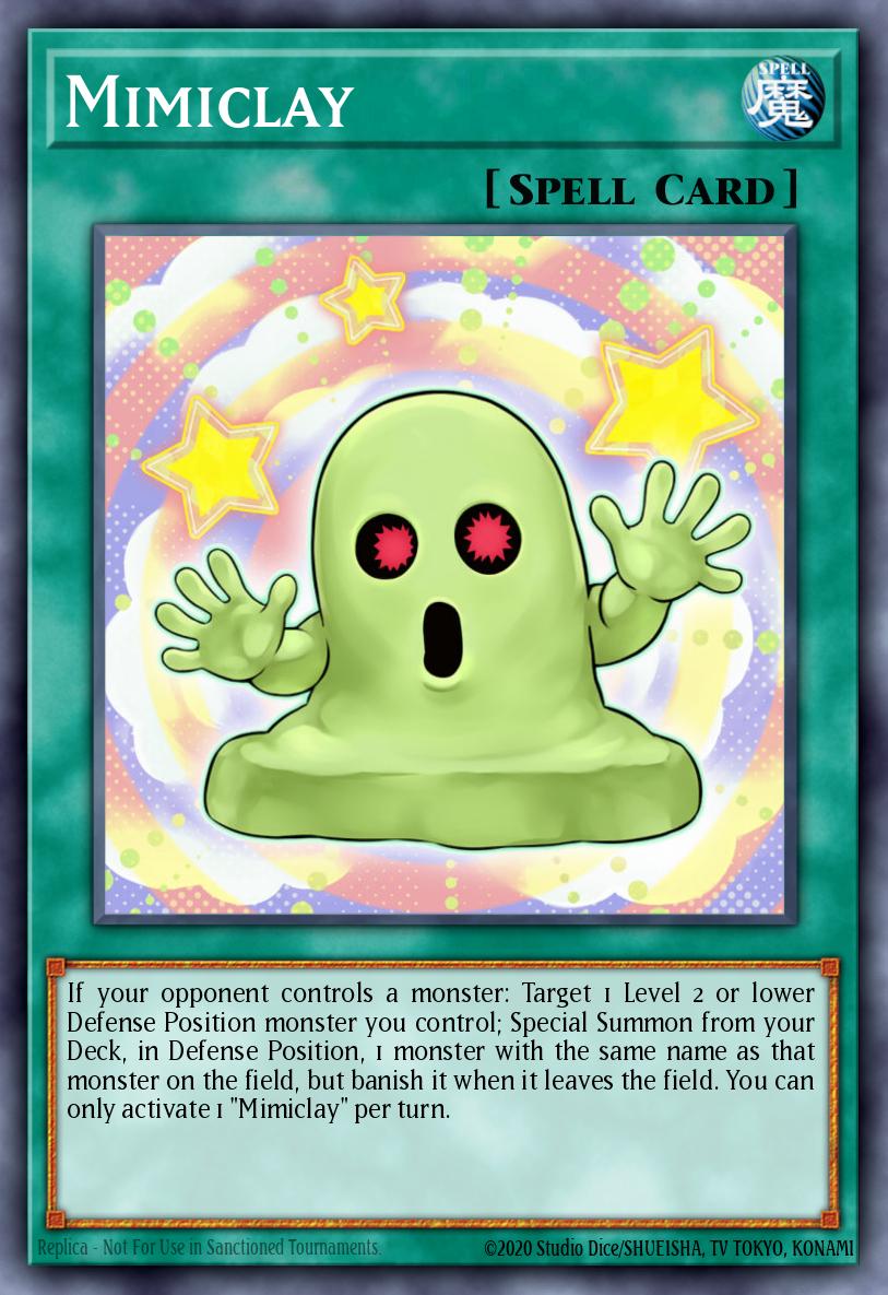If your opponent controls a monster: Target 1 Level 2 or lower Defense Position monster you control; Special Summon from your Deck, in Defense Position, 1 monster with the same name as that monster on the field, but banish it when it leaves the field. You can only activate 1 "Mimiclay" per turn.