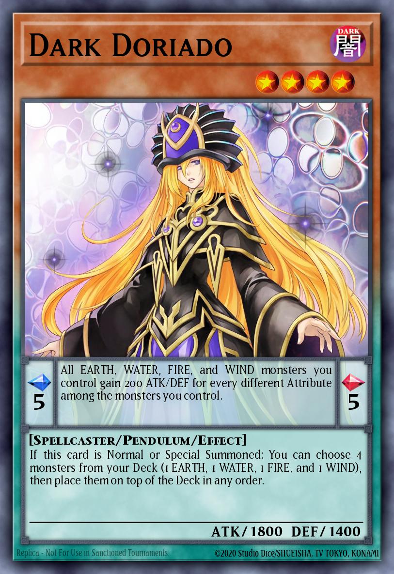 [ Pendulum Effect ] All EARTH, WATER, FIRE, and WIND monsters you control gain 200 ATK/DEF for every different Attribute among the monsters you control. [ Monster Effect ] If this card is Normal or Special Summoned: You can choose 4 monsters from your Deck (1 EARTH, 1 WATER, 1 FIRE, and 1 WIND), then place them on top of the Deck in any order.