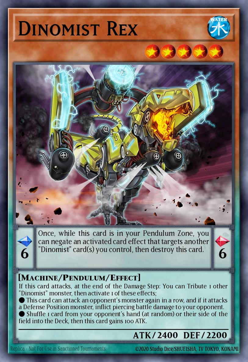 [ Pendulum Effect ] Once, while this card is in your Pendulum Zone, you can negate an activated card effect that targets another "Dinomist" card(s) you control, then destroy this card. [ Monster Effect ] If this card attacks, at the end of the Damage Step: You can Tribute 1 other "Dinomist" monster, then activate 1 of these effects; ● This card can attack an opponent's monster again in a row, and if it attacks a Defense Position monster, inflict piercing battle damage to your opponent. ● Shuffle 1 card from your opponent's hand (at random) or their side of the field into the Deck, then this card gains 100 ATK.