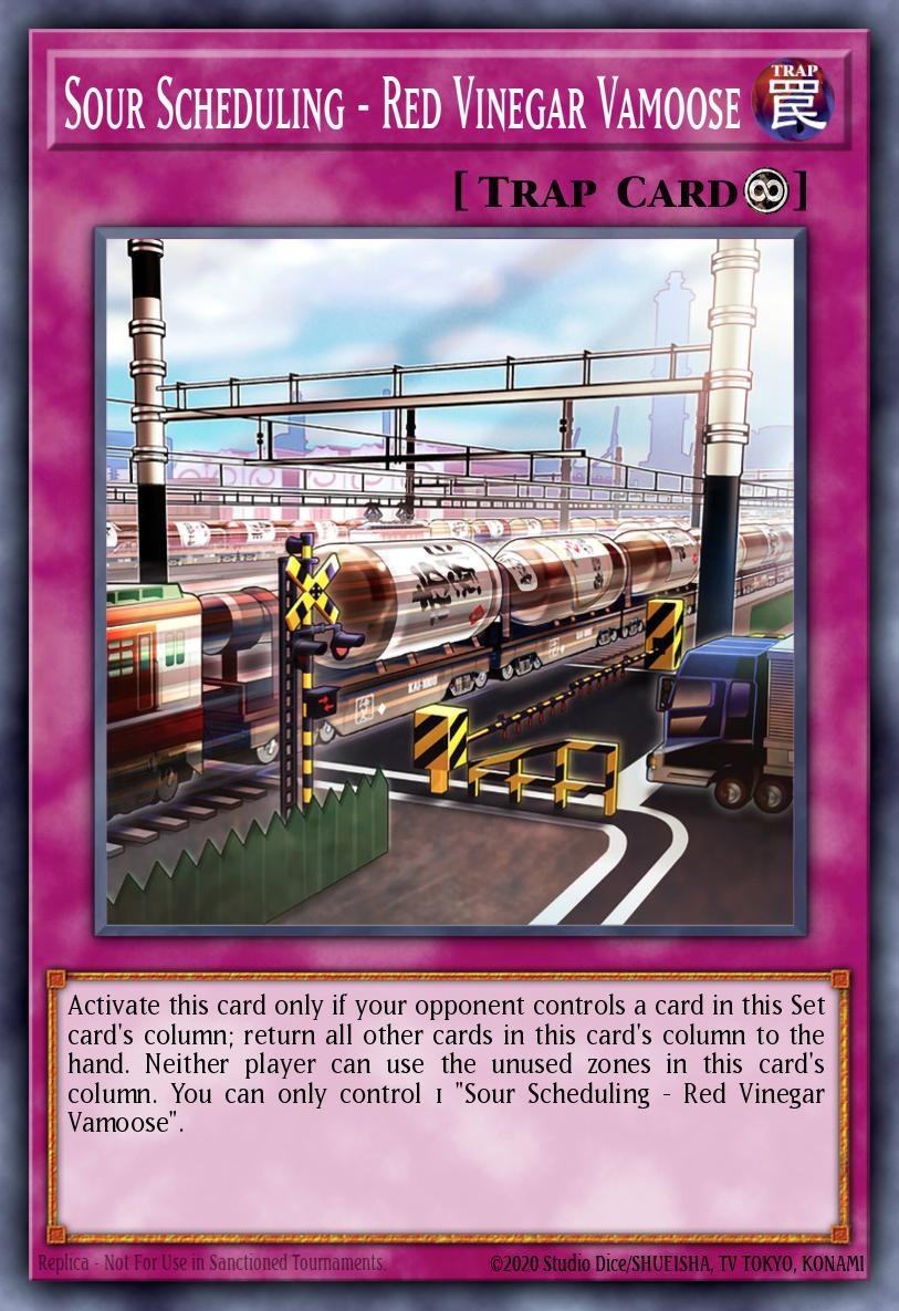Activate this card only if your opponent controls a card in this Set card's column; return all other cards in this card's column to the hand. Neither player can use the unused zones in this card's column. You can only control 1 "Sour Scheduling - Red Vinegar Vamoose".