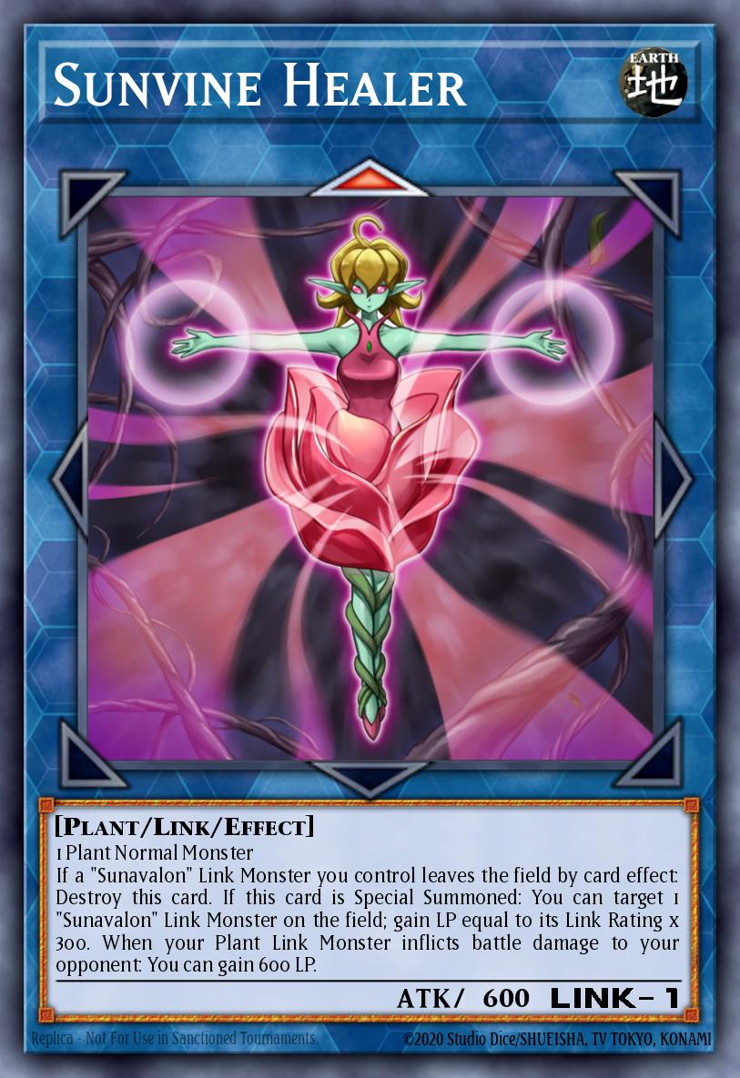 1 Plant Normal Monster If a "Sunavalon" Link Monster you control leaves the field by card effect: Destroy this card. If this card is Special Summoned: You can target 1 "Sunavalon" Link Monster on the field; gain LP equal to its Link Rating x 300. When your Plant Link Monster inflicts battle damage to your opponent: You can gain 600 LP.