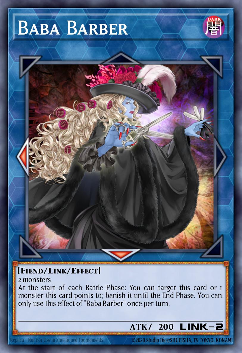 2 monsters At the start of each Battle Phase: You can target this card or 1 monster this card points to; banish it until the End Phase. You can only use this effect of "Baba Barber" once per turn.