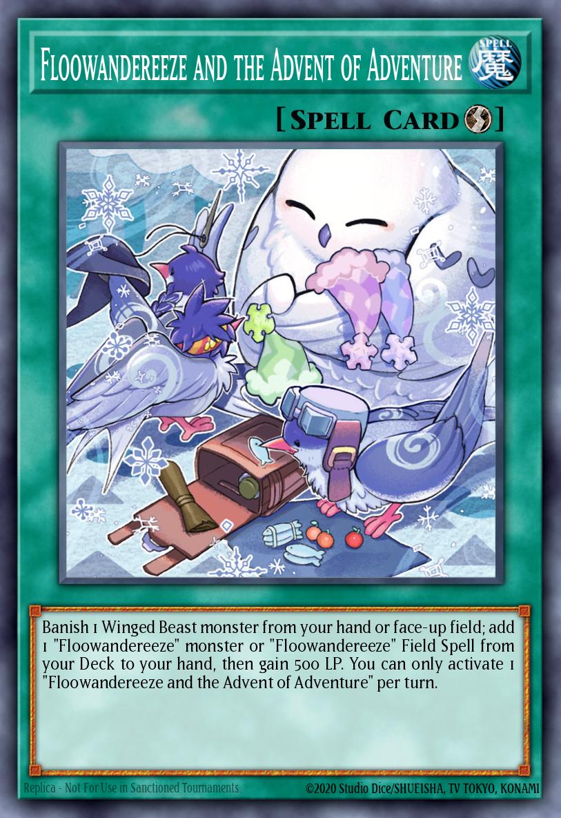 Banish 1 Winged Beast monster from your hand or face-up field; add 1 "Floowandereeze" monster or "Floowandereeze" Field Spell from your Deck to your hand, then gain 500 LP. You can only activate 1 "Floowandereeze and the Advent of Adventure" per turn.